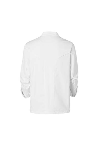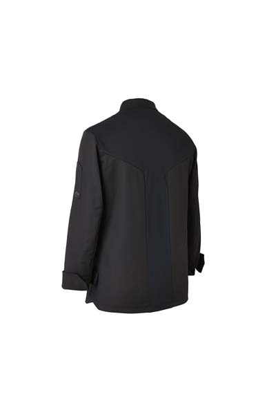 Veste de cuisine homme modèle Zef Noir. Col officier bords droits avec intérieur maille renforcé. Manches longues avec poche crayon sur manche gauche. Découpes latérales en maille piquée avec fentes pour plus d’aisance. Ouverture devant par 6 pressions cachées. Dos avec découpe géométrique en maille alvéolée pour une meilleure respirabilité. Finition demi-lune tissu à l’encolure dos.