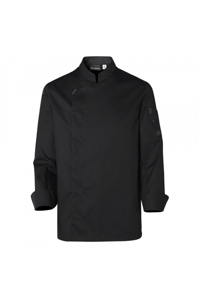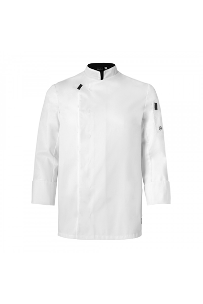 Veste Shade manches longues de la marque Molinel pour cuisiniers. Coupe regular avec col officier, ouverture asymétrique à pressions, manches longues et poche stylo. Design épuré avec détails gris anthracite, découpes de cintrage et aération sous les bras. Idéale pour cuisiniers, restaurateurs et autres professionnels des métiers de bouche.